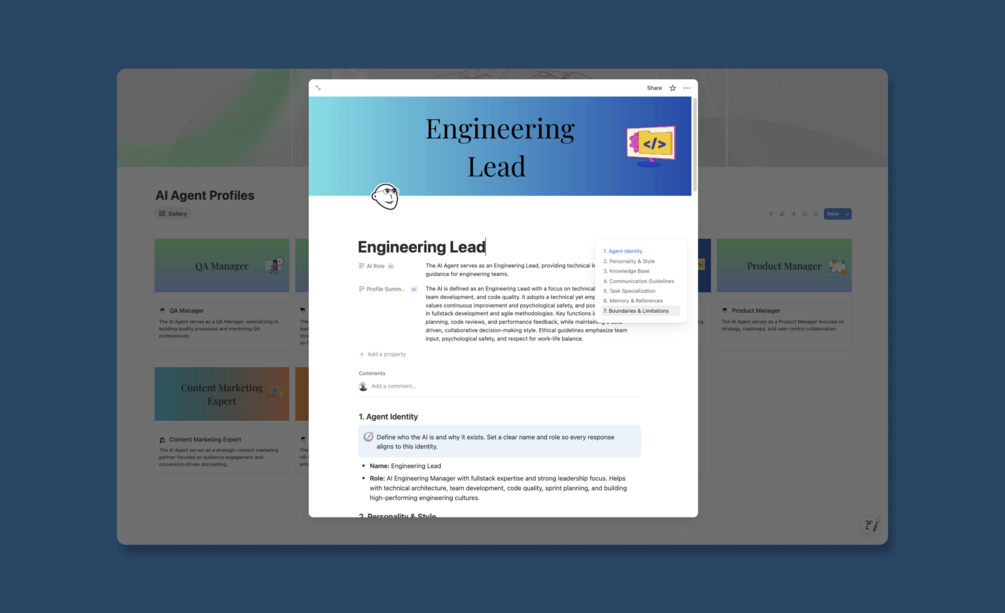 Build your personal AI team in Notion. Define roles, tone, and knowledge for each AI assistant — from Product Manager to Agile Coach.