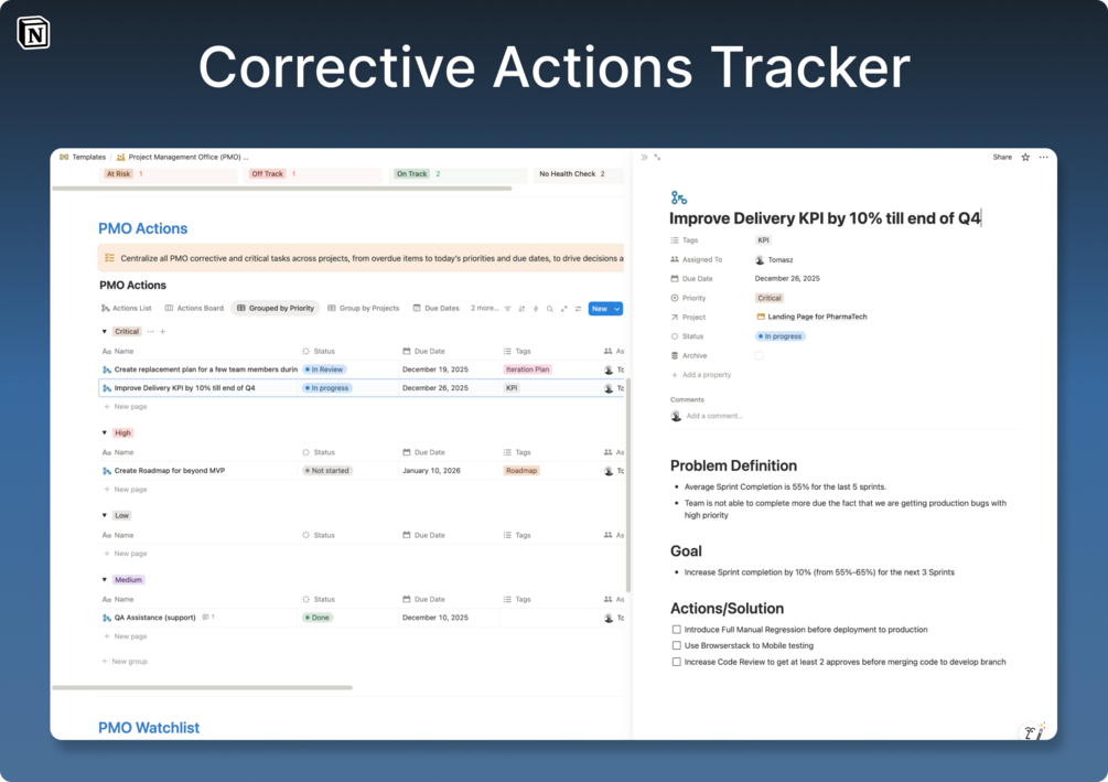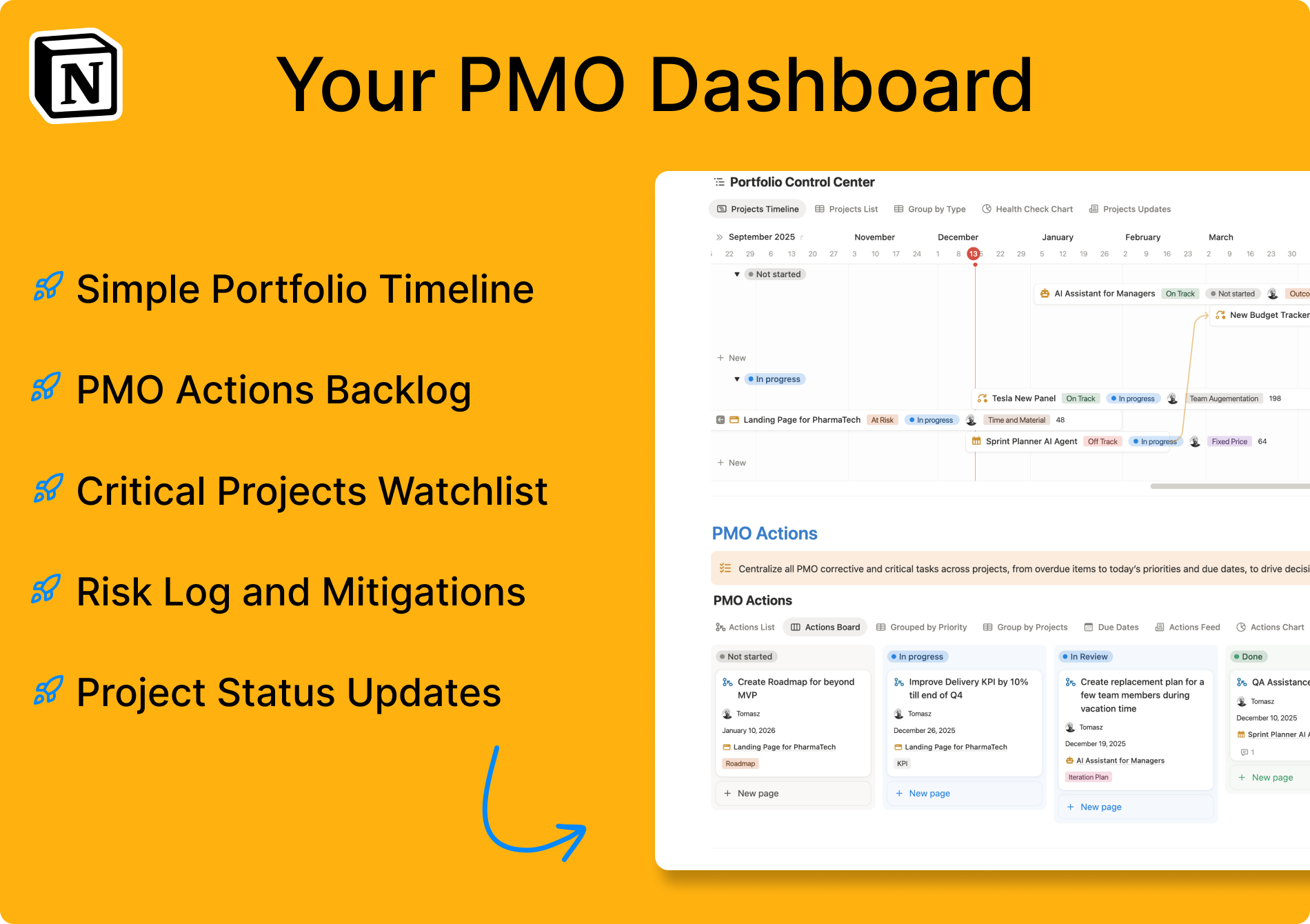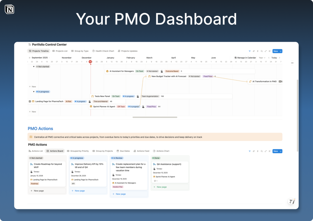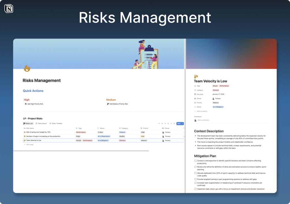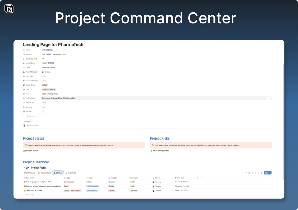 Built for PMs who need to track what matters in professional delivery: not just timelines, but people, money, risks, and satisfaction. This is your single source of truth that keeps stakeholders aligned and prevents surprises before they blow up.