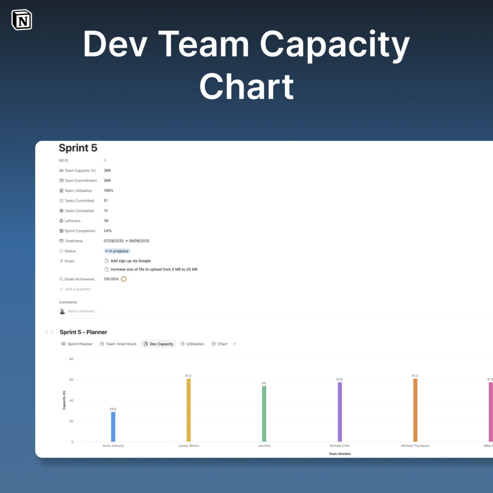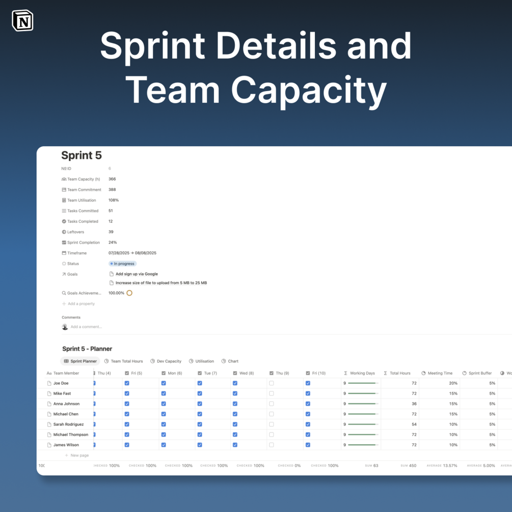 - Manage team members' availability, capacity, and workload distribution across tasks, meetings, and sprint buffer.